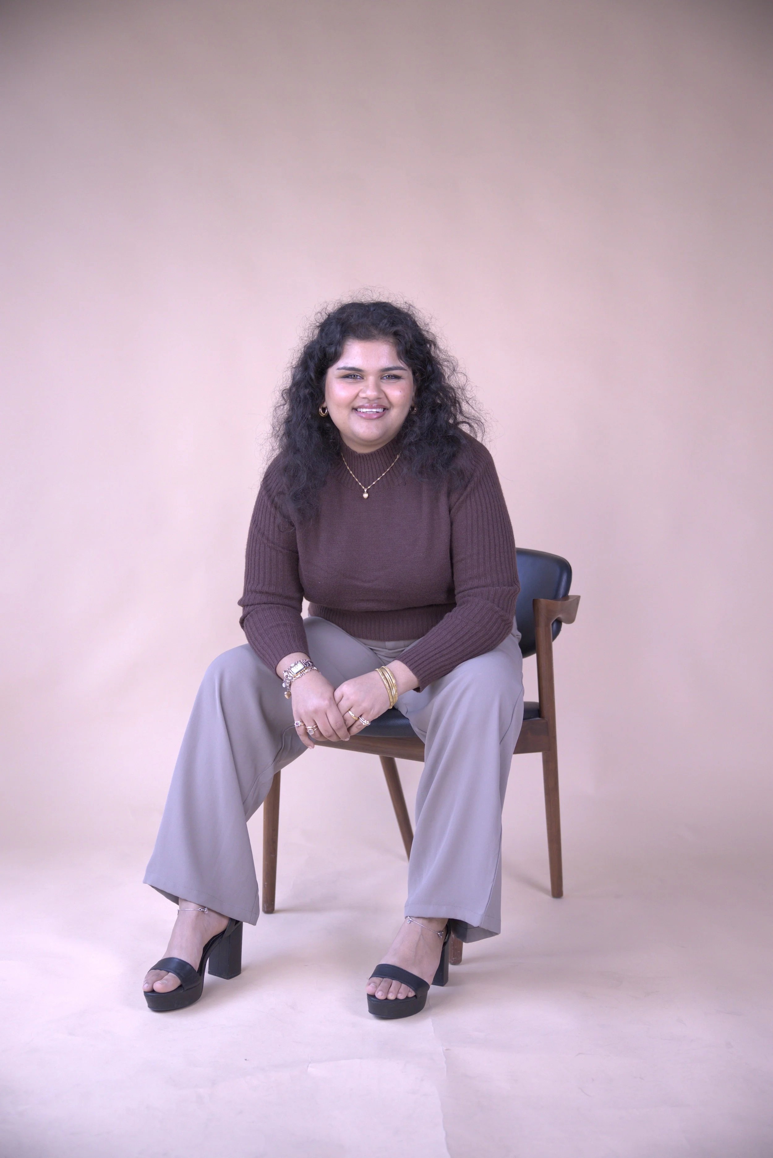 A woman with black curly hair smiling, sitting on a black and wooden chair against a beige background, wearing a brown sweater, beige wide-leg pants, and black high-heeled sandals, accessorized with jewelry.